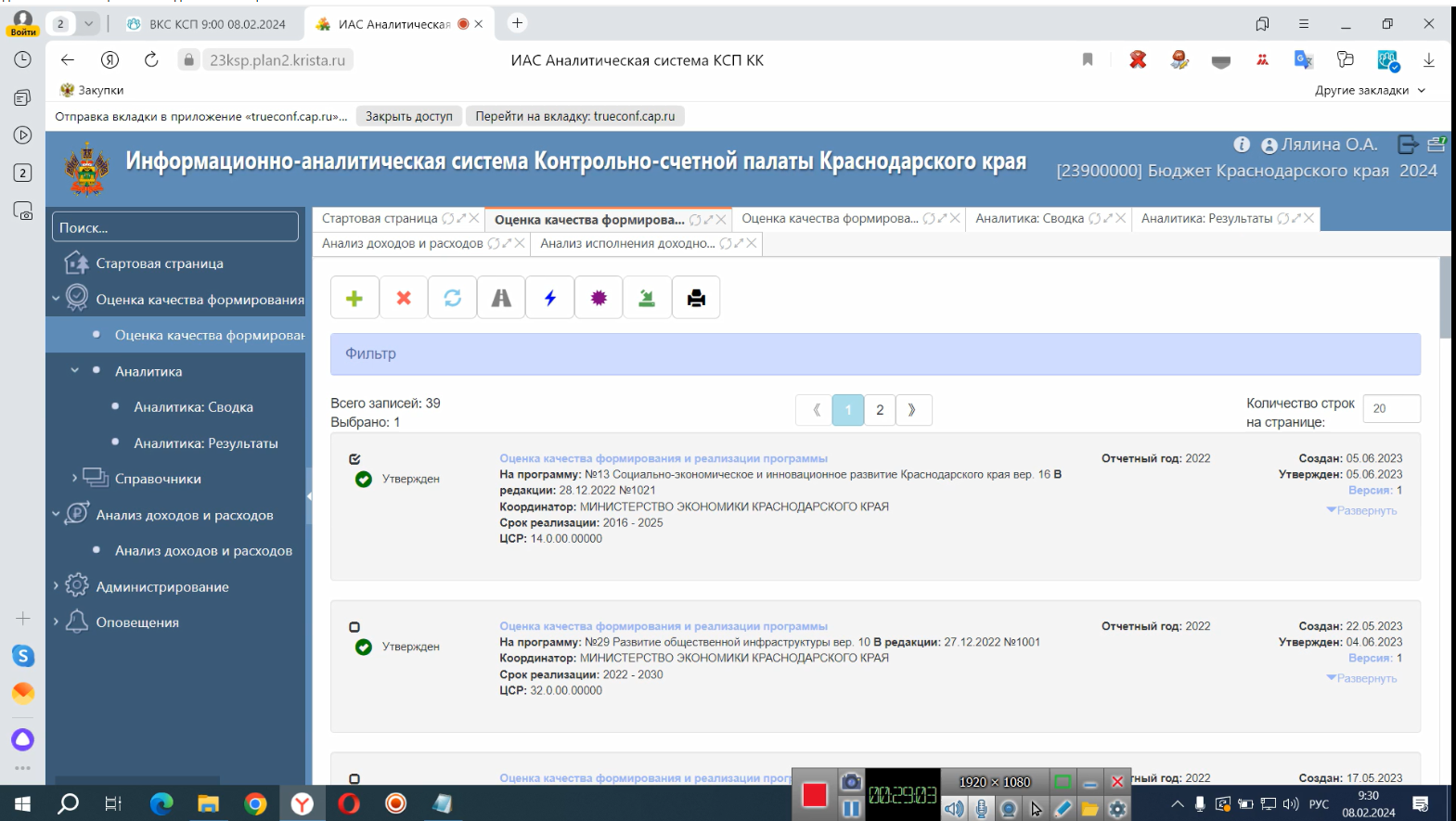 Особое внимание было уделено информационно-аналитической системе внешнего государственного финансового контроля Контрольно-счетной палаты Краснодарского края (далее – ИАС КСП КК), которая в 2022 году успешно разработана и внедрена в промышленную эксплуатацию и активно используется с 2023 года.